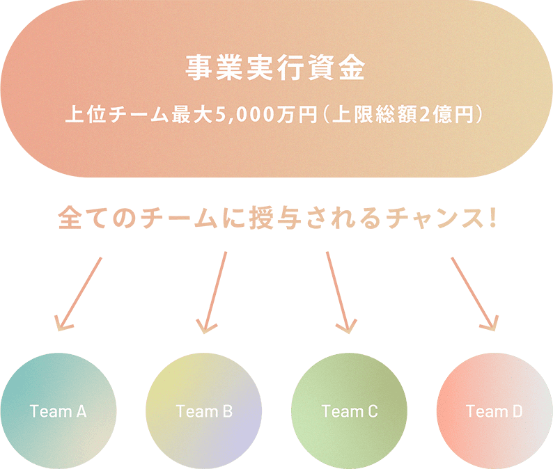 選考で上位に評価されたチームには、事業実行資金として最大5,000万円/チーム(上限総額2億円)を提供します。